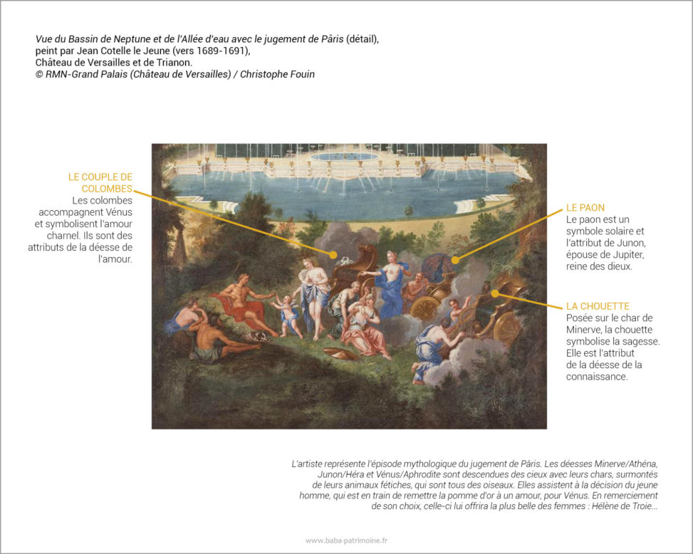 Vue du Bassin de Neptune et de l’Allée d’eau avec le jugement de Pâris (détail), peint par Jean Cotelle le Jeune (vers 1689-1691), Château de Versailles et de Trianon.
